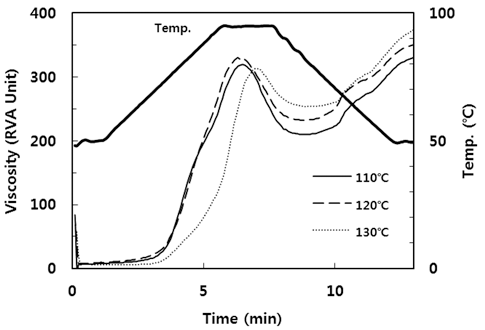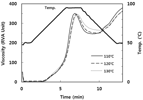 보리전분의 호화특성은 Rapid Visco Analyzer(RVA-3D, Newport Scientific, Australia)를 이용하여 측정하였다. 시료 는 Udy cyclone 분쇄기(Foss Tecator, S-26321, Hoganas, Sweden)를 사용하여 100 mesh 이하로 분쇄 후 12%(w/w) 의 현탁액을 제조하여 1분간 50°C 유지, 4.5분 동안 95°C 까지 가열, 95°C에서 2분간 유지, 4.5분 동안 50°C로 냉각 하는 RVA cycle의 점도변화를 측정하였다.