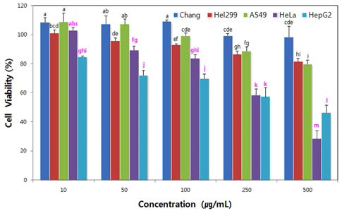 방울토마토 Betatini 품종 추출물이 정상 간세포(Chang), 정상 폐세포(Hel299), 폐암세포(A549), 자궁경부암세포 (HeLa) 및 간암세포(HepG2)의 생육에 미치는 영향을 알아 본 결과는 Fig. 2와 같다. 그리고 각 세포의 생육을 50% 억제하는 추출물의 농도인 IC50을 산정하여 Table 3에 나 타내었다.