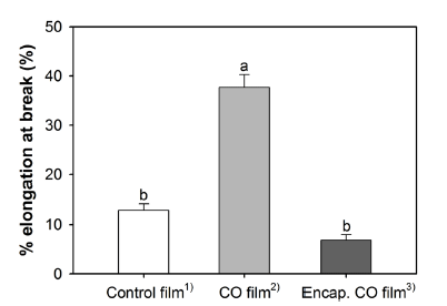 Percentage (%) elongation at break of the polypropylene films coated with ink with and without cinnamon oil (CO) which was either encapsulated or unencapsulated. The coated film was produced by a pilot-plant scale-film manufacturing system.