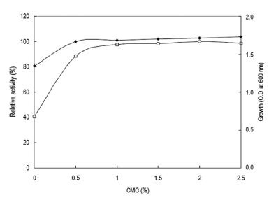 탄소원의 영향을 확인하기 위하여 Horikoshi I 배지에서 탄소원인 glucose를 제거하고 각 탄소원을 1% (w/v)씩 첨 가하여 배지를 제조하였다. 각 배양액으로부터 효소활성과 균체생육을 측정한 결과는 Fig. 5와 같았다. 탄소원으로 xylan (oat-spelt)을 이용하였을 경우 최대로 효소를 생산하 였으며, 균체의 생육은 glucose를 이용하였을 경우 최대로 생육하였다. 그러나 sodium carboxy methyl cellulose (CMC)를 탄소원으로 이용 시 xylan (oat-spelt)에 비하여 효소생산성이 10% 정도 낮았으나 CMC와 xylan (oatspelt) 의 가격을 비교한 결과 CMC가 xylan (oat-spelt)에 비 하여 13배 이상 가격이 낮으므로 CMC를 탄소원으로 이용 하는 것이 보다 효율적이었다. 또한 환원당인 glucose 등을 이용하는 경우 본 실험의 효소활성 측정방법인 DNS법에 있어 환원당의 잔당에 의한 정확한 효소활성의 측정이 어 려우므로 CMC를 탄소원으로 결정하였다. CMC 농도변화 에 따른 효소생산을 검토한 결과 배지에 1% (w/v) 농도로 첨가 시 최대 활성을 나타내었다(Fig. 6). 1% (w/v) 이상의 CMC 농도에서는 균체의 생육은 증가하나 효소활성은 큰 변화를 보이지 않는 것을 확인할 수 있었다. 그러므로 이 후의 실험에 있어 배지의 탄소원으로 CMC를 1% (w/v) 농도로 첨가하여 사용하였다.