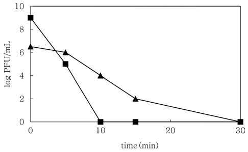 분리된 KCES2 파지와 ESP 2949-2 파지의 형태학적 특성을 투과 전자 현미경을 통해 확인한 결과 ES2는 Myoviriadae family에 속하는 것으로 나타났다(Fig. 1). 세 균을 숙주로하는 바이러스에 일종인 박테리오파지는 형태 학적인 특성에 따라 대부분 Siphoviridae, Myoviridae, Podoviridae family에 속하는 것으로 분류되는 것으로 알려 져 있다. 특히, Myoviridae family에 속하는 박테리오파지 는 수축성 tail을 갖는 특성을 가지고 있는 특성을 보유하 고 있다(Ackermann, 2007). 최근까지 알려진 C. sakazakii 의 박테리오파지의 경우 다수가 Myoviridae family에 속하 는 것으로 보고되고 있다. 그리고, KCES2 파지와 ESP 2949-2 파지에 대해 70℃에서의 열안정성에 대해 확인한 결과는 Fig. 2와 같다. KCES2 파지는 70℃에 노출했을 때 약 10분 후에 모두 사멸되는 것으로 나타났으며, ESP 2949- 2 파지의 경우는 약 2 log PFU/mL로 감소 후 30분 후 모 두 사멸하였다. Lee & Park (2011)이 보고한 C. sakazakii 파지의 경우도 30분 후 대부분이 사멸되는 것으로 확인되 었다. 기존에 보고된 일부 박테리오파지의 열안정성의 경 우는 70℃에서 30분 동안 처리했을 때 약 2~8 log PFU/ mL 수준으로 감소되거나 모두 사멸되는 것으로 나타났으 며(Buzrul et al., 2007; Li et al., 2010; Coffey et al., 2011; Lee et al., 2015), 일부 박테리오파지의 경우 90℃ 이상의 고온에서도 안정한 것으로 보고되었다(Guglielmotti et al., 2011).