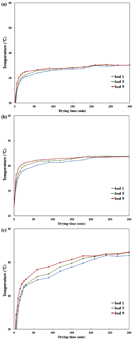 Temperature profile of the soybean during hot-air drying upon the tray position at (a) 35°C, (b) 45°C and (c) 55°C.