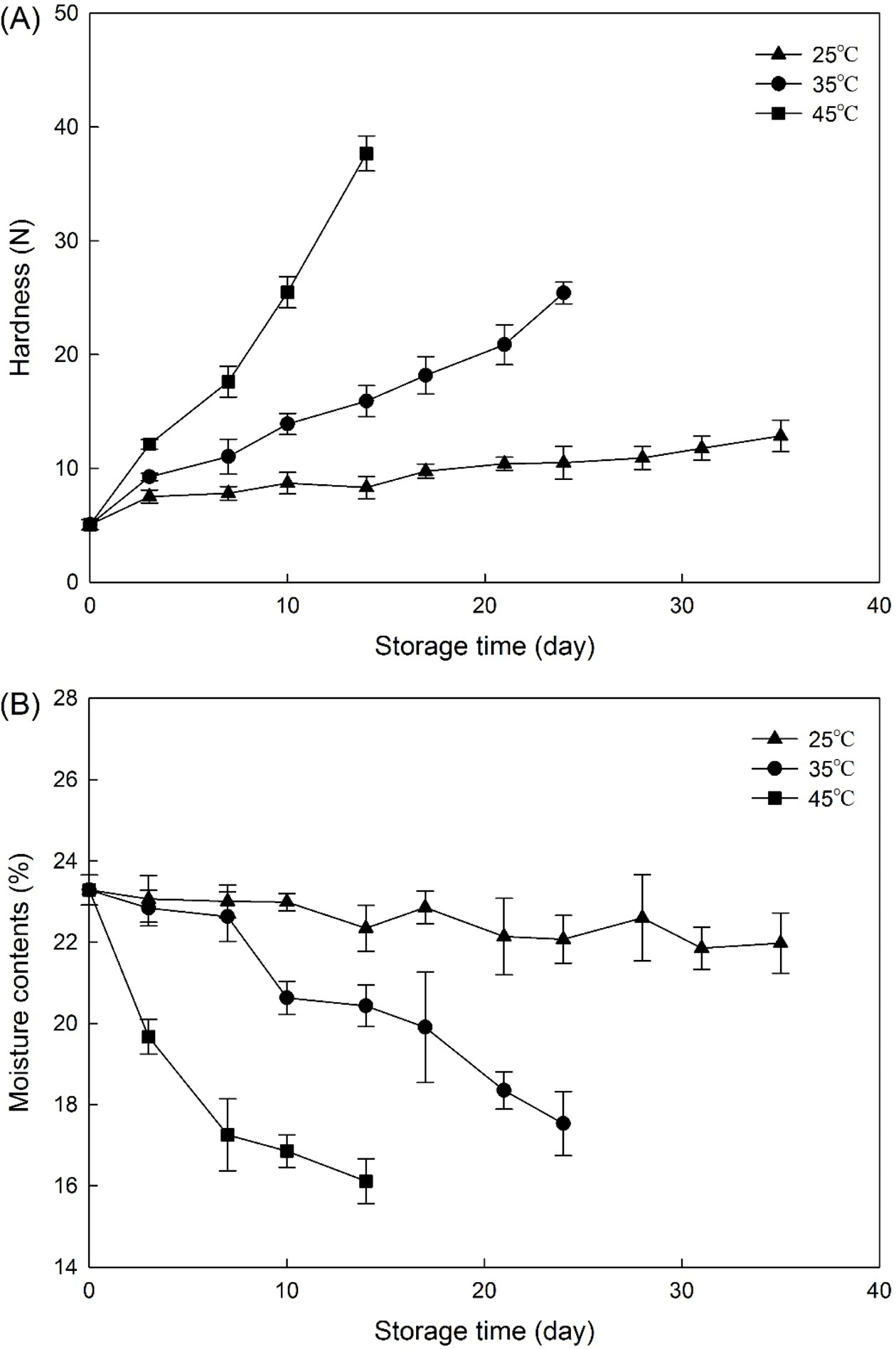저장 온도 25°C에서의 유통기한은 경도 9 N (Micard et al., 2000; Baixauli et al., 2008)을 허용한계값으로 정하고 회귀 분석식을 통해 예측하였다. 저장 온도 35°C와 45°C 에서의 유통기한은 Q10 값을 이용하여 구하였다(Lee et al., 2006; Galić et al., 2009).