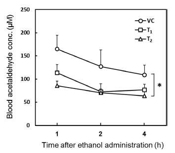 SD rats were orally administrated enzymatic extracts from S. libertina before 30 min alcohol treatment. And then collected serum at each time point. VC means only 40% ethanol treated group, T1 means 500 mg/kg of S. libertina extract treated group, T2 means 1000 mg/kg of S. libertina extract treated group. Blood samples were analyzed for acetaldehyde as described in the ‘Materials and Methods’ section. Values for blood acetaldehyde are means ± standard error (bars) for each group of 7 SD rats. Test groups were compared with the saline-pretreated vehicle control group (VC) by repeated-measures analysis of variance (ANOVA). Asterisk indicates a significant difference from VC group, *p<0.05.