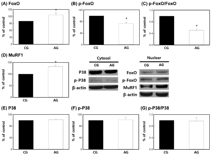 본 연구 결과, FoxO 발현(Fig. 2A)은 AG군에서 CG군 에 비해 126.4±9.75% 수준으로 유의하게 증가(p<0.01)하 였으며, p-FoxO 발현(Fig. 2B)은 AG군에서 73.3±3.89% 수준으로 유의하게 감소(p<0.01)하였다. 그리고 AG군의 p- FoxO/FoxO (Fig. 2C)가 51.0±4.00% 수준으로 유의하게 감소(p<0.01)하였다.