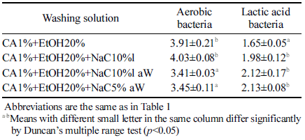 세척방법에 따른 배추즙의 미생물수는 Table 5와 같다.