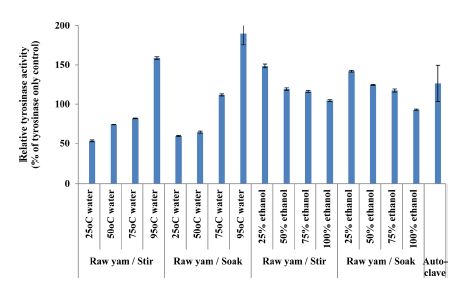 마 분말과 생 마 추출물의 tyrosinase 활성 억제 결과를 Fig. 6과 Fig. 7에 각각 나타내었다. 마 분말의 경우 모든 샘플에 해당되는 것은 아니지만 대부분의 샘플에서 에탄올 추출 보다는 열수추출과 가압 가열 추출법에서 tyrosinase 활성 억제능이 높게 나타났으며, 특히 회분법으로 추출한 시료에서는 75, 95ºC에서 각각 148.30%, 142.03%, 침지법 으로 추출한 시료에서는 50, 95ºC에서 각각 147.57%, 133.03%, 가압 가열법으로 추출한 시료에서는 139.07%로 높게 나타났다.