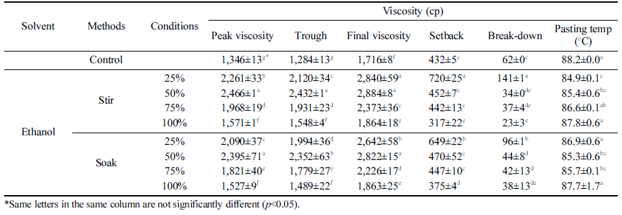 추출 후 침전물의 호화특성을 AACC Method 61-02에 의하여 Rapid Visco Analyzer (Newport Scientific, RVASuper4, Sydney, Australia)를 이용하여 측정하였다. 각 시료 는 건물 기준으로 14% 수분함량이 되도록 제조하였으며, 측정온도는 1분간 50ºC를 유지하고 95ºC까지 12ºC/min의 속도로 온도를 상승시킨 후 2분 30초 동안 95ºC를 유지, 12ºC/min의 속도로 50ºC까지 온도를 하강시킨 후 50ºC에 서 2분간 유지하여 점도곡선을 얻었다. 얻어진 점도 곡선 으로부터 호화 온도(pasting temperature), 최고 점도(peak viscosity), 최저 점도(trough), 최종 점도(final viscosity)를 측 정하고 이들 측정치로부터 breakdown, setback 값을 구하 였다.