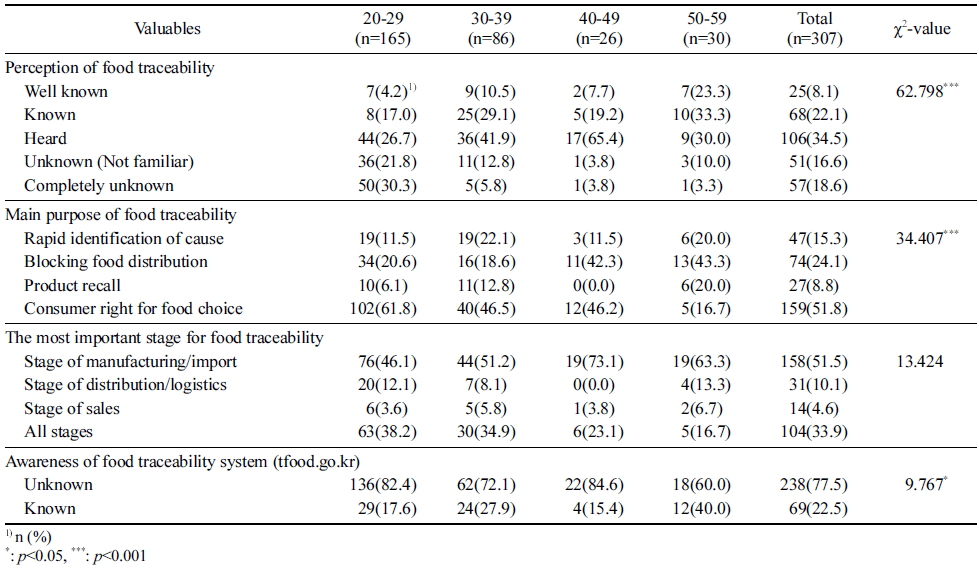 또한 식품이력추적에서 중요하다고 생각하는 공급체인의 단계는 모든 연령층에서 ‘제조·수입’ 단계를 158명(51.5%) 이 우선으로 선택하였고, 그 다음 식품공급체인의 ‘모든 단계’를 104명(33.9%)이 선택한 반면 ‘유통·물류’와 ‘판매’ 단계를 선택한 경우는 낮은 경향을 보였으나 통계적인 유 의성은 없었다. 녹색소비자연대 회원을 대상으로 이력추적 과의 연관성에 대한 선행연구에서 식품안전성(39%), 원산 지 증명(20%), 식품안전 불안감 해소(20%), 품질관리(16%), 문제발생 시 회수·폐기(4%), 생산방법 또는 제조방법(2%), 물류 효율성(0%) 순으로 조사되었으며 이는 본 연구 결과 에서 조사된 것과 같이 소비자는 식품이력관리를 식품 안 전성과 관련된 것으로 인식하고 있었다(Jo, 2016). 2009년 부터 정부차원에서 중앙집중식으로 운영하고 있는 식품이 력추적관리시스템에 대하여 69명(22.5%)만이 ‘알고 있다’ 고 응답하였으며, 특히 20대는 29명(17.6%), 40대는 4명 (15.4%)만이 ‘알고 있다’고 응답하였다(p<0.05). 우리나라에 서 쇠고기이력추적 의무화 이후 이력추적관리에 대한 인식 이 전반적으로 높아지고 있으나 20대의 식품이력추적에 대 한 인지도는 매우 낮은 실정이므로 20대를 대상으로 식품 이력추적관리에 대한 관심을 유도하는 노력이 필요할 것으 로 생각된다. 식품이력추적과 관련된 식품공급체인의 다양 한 이해관계자(생산자)와 정책 입안자는 서로 협력하여 식 품이력추적관리의 연령대별 인식차이를 고려한 차별화된 전략으로 소비자 인식을 높이도록 노력하여야 한다.