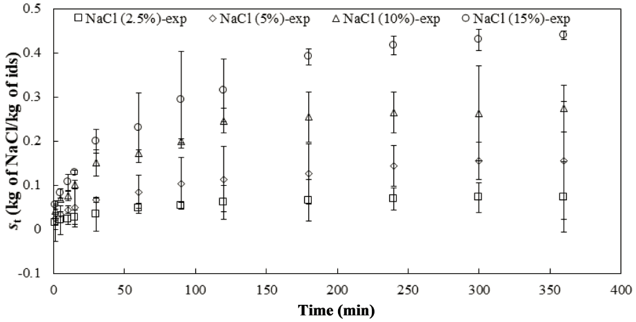 시료의 수분함량(moisture content)은 105oC 상압 가열 건조법에(AOAC, 2000)에 의해 측정하였다. 소금 함량(salt content)은 Volhard법 (AOAC, 2000)에 의해 0.1 N NH4SCN 으로 적정하여 시료 중의 NaCl양을 측정하였다. 수분 및 소금 함량은 kg of moisture/kg of initial dry solids (ids) 및 kg of NaCl/kg of initial dry solids (ids)로 각각 표현 하였다. 실험은 각 처리구 당 3번 반복 측정을 실시하여 평균 및 표준편차를 기록하였다.