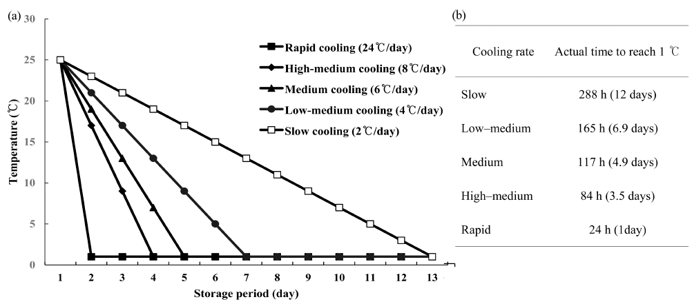 The Scheme of temperature changes (a) and actual time to 1 °C (b) were shown in Fig. 1. The temperature change in the storage house varied from the beginning of storage, but remained constant after 15 days. The temperature in the storage house reached 1 °C in the following order : rapid cooling, high–medium cooling, medium cooling, low– medium cooling, and slow cooling. Because of the respiratory heat of cabbage, as reported by Hyang et al. (2013), very slow cooled kimchi cabbage, which decayed after 4 days, was excluded from the experiment.