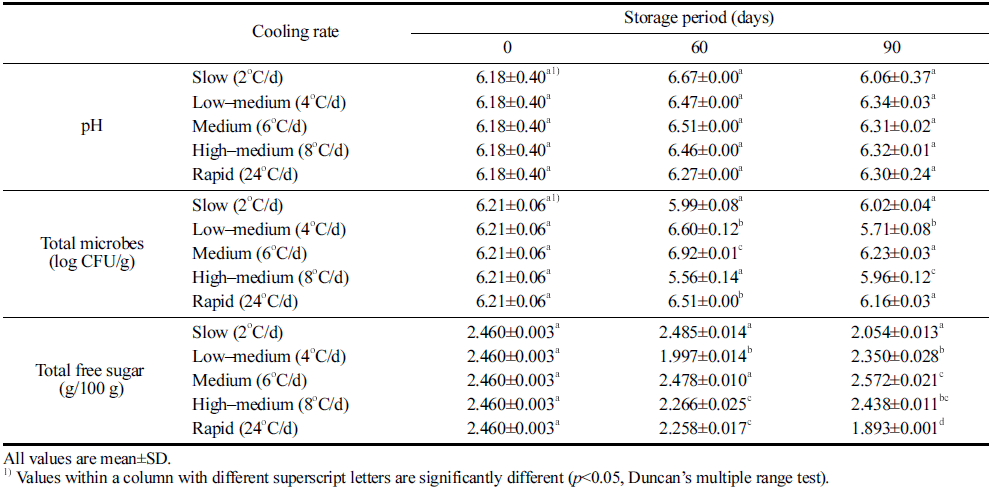 A sensory evaluation of kimchi prepared using fresh cabbage and stored cabbage for 90 days at different cooling rates was performed (Table 3). As kimchi fermented, sensory evaluation was examined on the day 0 (pH 5.8-6.0), day 8 (pH 4.5-4.7) and day 40 (pH 3.8-3.9). Texture of kimchi made with stored cabbage tended to be weaker than kimchi made with fresh cabbage (not significant), but kimchi made with stored cabbage cooled by medium cooling and slow–medium cooling rates was relatively superior. The overall preference of kimchi prepared using cabbage stored at medium cooling and slow– medium cooling rates was higher than that of kimchi prepared using cabbage stored at other cooling rates, and not significantly different from kimchi prepared using fresh cabbage. Thus, we showed that the medium- and slow– medium-cooled storage of spring kimchi cabbage for 90 days did not affect the sensory quality of kimchi.