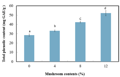 Total phenolic content as botanical antioxidants possessed in oyster mushroom is essential to physiological human health that can be conflict free radical substance, which has played an important role in inhibiting aging processes such as cancer, and various inflammatory disease as well as functional decline (Khatun et al., 2015). TPC of FFS-based extruded meat analog is shown in Fig. 6. In the present study, the highest TPC was observed as 52.09 mg GAE/g in FFS-based extruded meat analog with 12% oyster mushroom contents whereas the lowest was obtained as 28.54 mg GAE/g at 0% oyster mushroom contents. TPC increased with the increase in oyster mushroom contents. A similar finding was also found by Ma & Ryu (2019) who revealed that the addition of green tea in ISP-based extruded meat analog led to increasing the TPC. Moreover, Maung (2020) also similarly reported that TPC and flavonoid content of FFS-based was higher than in ISP-based extruded meat analog.