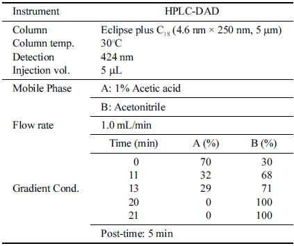 커큐미노이드 함량을 분석하기 위해 Eclipse plus C18 column (4.6 nm× 250 nm, 5μm)을 사용한 Agilent Technologies 1260 Infinity II HPLC system (Agilent Technologies, Inc., Santa Clara, CA, USA)를 이용하여 측정 후 나타내었고, 이동상은 A: 1% Acetic acid, B: Acetonitrile, 이동상의 유 속은 1.0 mL/min의 조건을 사용하였다. 분석조건은 Table 2에 나타내었다.