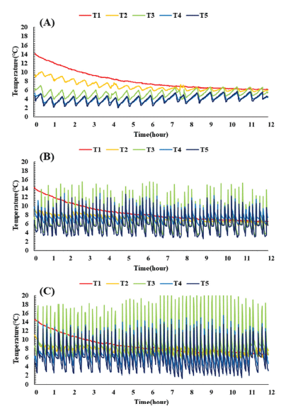 식품(T1), 포장박스내부(T2), 냉장고 내부를 상(T3), 중 (T4), 하(T5)에 온도측정을 위한 Thermocouple을 부착했으 며, 상추를 저장할 때 온도의 변화는 Fig. 2에 나타내었고 분쇄육을 저장할 때 온도의 변화는 Fig. 3에 나타내었다. 냉장고 높이별 내부의 온도분포는 A, B, C 모든 방법에서 동일하게 상부(T3)>중부(T4)>하부(T5) 순으로 높았다. 하 부에서 상부로 갈수록 평균온도가 증가하였고, 특히 도어 개방이 길어질수록 높이별 평균온도 차이는 더욱 컸다. Heo et al. (2013)의 연구에서는 냉장고 내부의 온도는 하 부에서 상부로 올라갈수록 온도가 증가하였다고 보고하였 으며, 본 연구에서 또한 이와 유사한 결과가 나타났다. 이 는 차가운 공기는 비교적 따듯한 공기보다 밀도가 높아 가 라앉아 냉장고 하부에 분포하다가 도어 개방시에는 하부의 차가운 공기가 외부로 흘러나가고 이때 생긴 공간에 외부 의 따듯한 공기가 들어오기 때문이라고 생각된다. 상추 및 분쇄돈육을 포장한 박스의 내부의 평균온도는 도어 개방시 간이 길어질수록 박스 내부의 평균온도가 증가하였다. 실 험에 사용한 포장박스는 일반적인 스티로폼 박스로 종이박 스에 비해 단열성능이 약 2.5배 우수하다(Ryu et al., 2019). 하지만 단열성능이 우수하더라도 스티로폼 박스는 기포층 이 많아 쉽게 파손되고 유해한 미세플라스틱이 되어 처리 가 쉽지 않아 환경문제로 연결되기 때문에(Lee et al., 2022), 단열이 우수하면서도 친환경적인 포장박스에 대해 추가적인 연구가 필요하다고 판단된다. 식품의 품온은 상 추가 A 방법에서 3.60±0.72°C, B 방법에서 5.53±0.82°C, C 방법에서 6.82±0.90°C이였고, 분쇄돈육은 A 방법에서 7.56±1.35°C, B 방법에서 7.77±1.42°C, C 방법에서 8.31± 1.6°C였다. 상추와 분쇄돈육 모두 문 도어 개방시간이 길어 질수록 품온뿐만 아니라 온도편차 또한 증가하였다. 냉장 고의 설정온도는 5°C로 설정되어있었지만, 상추의 A 방법 을 제외한 다른 방법들은 평균온도가 5°C 이상인 것을 보 여주었다. Park & Bahk (2017)의 연구에서도 냉장·냉동 배송 차량 내의 설정온도보다 식품의 품온이 높게 측정되 었다는 결과를 보여주었다. 이는 식품의 유통과정 중에 도 어 개방의 시간이 식품의 품온에도 영향을 미쳐 신선냉장 식품의 품질저하를 발생시킬 수 있다고 판단된다.