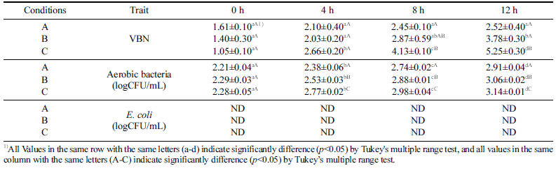 육류의 VBN은 단백질이 세균의 환원작용이나 자가 분 해 효소에 의해 저분자 물질인 albumose, peptide, amino acid 등인 휘발성 물질로 분해된다(Corespo et al., 1978). 이때 발생하는 여러 가지 종류의 가스는 유기산, 색소, 악 취 등을 생산하고 변질의 원인이 되기 때문에 VBN은 육 류의 신선도 판단에 이용된다(Han et al., 1978). 분쇄돈육 의 VBN 값의 측정결과는 Table 6에 나타내었다. 초기 VBN 값은 1.05-1.61 mg%였지만 VBN 값의 변화는 12시 간 저장하였을 때, A는 2.52 mg%, B는 3.78 mg%, C는 5.25 mg%로 도어 개방시간이 길수록 VBN 값은 증가하였 다. 식품공전 제5. 식품별 기준 및 규격의 17. 식육가공품 및 포장육에 따르면 분쇄육은 휘발성염기질소가 20mg% 이하로 제한하고 있으며, 본 연구에서는 모의 유통환경에서 저장했던 분쇄육들은 모두 규격 이하의 값을 나타내었다.