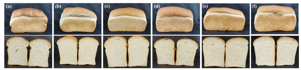 The white pan bread was prepared by the straight dough method according to AACC (2000) with some modifications, and its final composition is shown in Table 1. All ingredients except butter were mixed using a mixer (SP-800A, Spar Food Machine Co. Ltd., Taichung, Taiwan) at 130rpm for 3 min and 235 rpm for 2 min. The butter was then added and mixed at 130rpm for 3 min and 235 rpm for 10 min. The gluten window test was used to check for gluten formation, and if not enough gluten was produced, the dough was mixed for an additional 2 min at 235 rpm. The primary fermentation of the dough was performed at 27°C and 75% relative humidity (RH) for 1 h using a fermenter (Electric Proofer, PBC-PDM8, Ilsintech, Hanam, Korea), and then the dough was divided into 380g portions for preshaping. The intermediate proofing was carried out at 27°C, 75% RH for 30m in, after which the dough was molded. The final fermentation was performed at 38°C, 80% RH for 1 h, and if the bread did not rise sufficiently, the fermentation was continued for another 5 min until the bread filled at least 90% of the mold. The bread baking was conducted for 25 min in an oven (OV750, Living Well Korea, Seoul, Korea), preheated to a top temperature of 180°C and a bottom temperature of 220°C, followed by cooling for 1 h at room temperature.