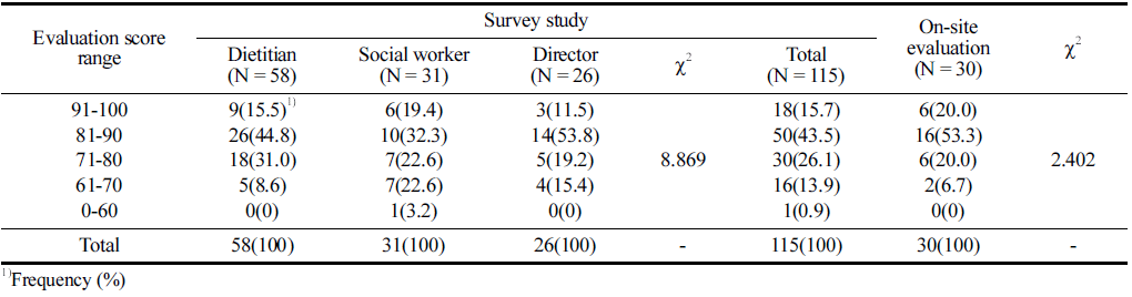 On-site evaluations generally involve reviewing documents and performance data and providing the assessors with detailed and supplementary information on diverse aspects of the operations of foodservice through the data they hold (Lawrenz et al., 2003). Among the elderly welfare centers participating in the survey study, 30 elderly welfare centers in Seoul and Gyeonggi Province were visited in May 2017. An objective evaluation of experts was conducted on the performance of the elderly welfare centers based on four perspectives. For each indicator related to the evaluation, the status of the preparation of required documents was confirmed, and the operational status and performance of the work were verified during onsite evaluations. The evaluation indicators based on the four perspectives were calculated into scores according to the weight of each item. The evaluation score was quantified based on a total score of 100, which was compared with the survey study results.