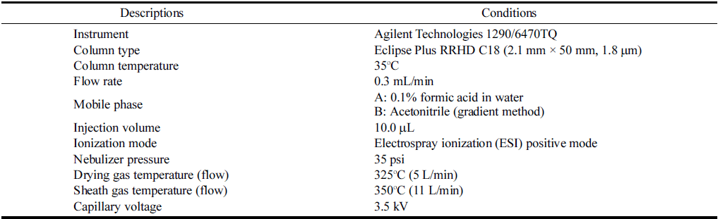 미리 결정된 숙성기간별 채취한 과일청 1 g은 탈이온수 를 이용하여 3배 희석하여, methanol 2 mL와 탈이온수 2 mL로 활성화된 S ep-Pak C18 S PE c artridge (200mg/3 cc, Waters, Milford, MA, USA)에 1mL를 주입한 후 탈이온 수(3 mL)를 이용하여 세척하고 methanol (1 mL)로 용출시 켜 시안배당체를 회수하였다(Park et al., 2020;Zhong et al., 2020). 회수된 여액은 0.2 mm nylon syringe filter를 통 과시킨 후 LC-MS/MS (Agilent Technologies 1290/6470TQ, Santa Clara, CA, USA)를 이용하여 시안배당체를 분리하 였다. 시안배당체 분석을 위한 LC-MS/MS 기기 운전조건은 Table 1에 제시하였다. MRM (multiple reaction monitoring) mode로 시안배당체(아미그달린 및 프루나신)별 MRM transition의 정량/정성 이온을 확인하였다. 아미그달린 모분 자이온(m/z = 480.1)에 대한 딸이온은 m/z = 347.2, 373.9, 259.1로 설정하였으며, 프루나신 모분자이온(m/z = 318.1)에 대한 딸이온은 m/z = 184.9, 128.9, 121.0으로 설정하였다. 이들 이온 중 m/z = 347.2 (CE:30)를 아미그달린의 정량이 온으로 설정하였고, m/z = 373.9 (CE:30)와 m/z = 259.1 (CE:34)를 아미그달린의 정성이온으로 설정하였다. 프루나 신은 m/z = 184.9 (CE:16)를 정량이온으로 설정하였고, m/ z = 128.9 (CE:16)와 m/z = 121.0 (CE:14)를 프루나신의 정 성이온으로 설정하였다. LC-MS/MS 크로마토그램으로부터 얻은 시안배당체 정량이온 피크의 면적을 시안배당체 표준 품을 이용하여 작성된 검정곡선을 이용하여 시안배당체 함 량을 결정하였다.