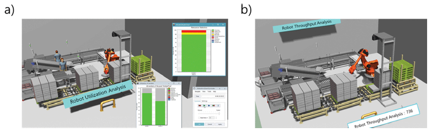 기존 팔래트에 적재된 고중량 박스를 언로딩 및 해체하 는 공정은 실제 현장에서 작업자 1인이 하루 254개의 박 스를 처리하며, 총 2인이 약 508개의 상자를 해체하는 것 을 측정하였다. 측정한 생산량을 기반으로 시뮬레이션 결과 Fig. 7에서 분석한 것과 같이 작업자의 가동률은 99.97%로 분석되었다. 전체 수행 공정 중에 거의 모든 공정이 수작 업으로 이루어져 있어 작업자에게 노동 과부하가 되는 것 을 도출하였다. 반면에, Fig. 8(a)과 같이 로봇을 적용하여 개선한 공정의 경우, 로봇의 가동률은 88.5%로 일부 개선 하였으며, 동일한 생산 시간 동안 고중량의 작업물을 이송 하는 공정을 제외함에 따라 2인의 작업자는 약 736개의 상자를 처리할 수 있음을 분석하였다.