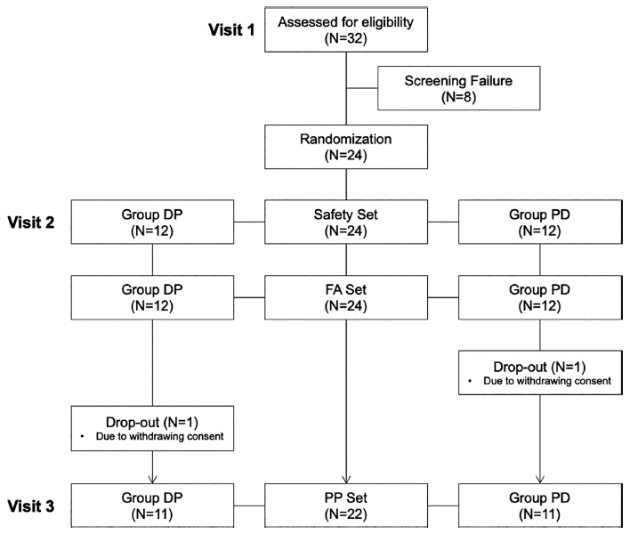In this study, a cohort of 32 individuals were screened for eligibility. A total of 24 individuals (12 each in the DP group and the PD group) met the eligibility criteria and underwent randomization. The study procedures were exclusively carried out on the individuals who completed the full trial without any significant violations that could have impacted the results. One individual in the PD group withdrew consent and discontinued participation. Additionally, among the participants whose breath alcohol concentrations exceeded 0.1% after 0.5 h of drinking during visit two, one participant exhibited a test value in visit two that was twice as high as that in visit three. Consequently, 22 participants (11 each in the DP group and 11 in the PD group) were included in the analysis, following the exclusion of participants due to deviations from the crossover design (Fig. 2).