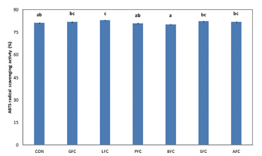 ABTS 자유 라디칼 소거 활성능 측정은 ABTS cation decolorization assay 방법 Re et al. (1999)을 수정하여 실시하였다. 7 mM ABTS 용액과 2.5 mM potassium persulfate를 혼합하여 24시간 암소 보관하여 ABTS radical (ABTS+)을 만들고, ABTS radical은 732 nm에서 0.7±0.02의 흡광도 값이 되도록 희석하여 ABTS 용액으로 사용했다. 96 well plate에 ABTS+ 용액 100 μL와 농도별 희석한 시료 100 μL를 넣고 반응시킨 후 분광광도계(Multiskan SkyHigh; Thermo Fisher Scientific, Inc. Spain) 732 nm에서 흡광도를 측정하였다. 시료의 ABTS 자유 라디칼 소거 활성능은 시료 첨가구와 무첨가구의 흡광도 차이를 백분율로 표시하였다.