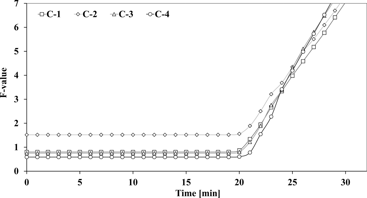 설정 온도 121.1°C에서의 F값을 계산한 결과를 Fig. 3에 나타내었다. F값의 계산은 시간에 따라 변화하는 온도에 대한 치사율(lethality)값을 모두 합하는 수식 (6)을 이용하 여 계산하였다. 설정 온도와 달리 내부 온도의 편차는 각 구간별 편차를 보였으며, 시간이 증가함에 따라 C-1과 C-4 에서 F값의 큰 차이를 나타냈다. C-1과 C-4에서 각각 F값 4에 도달하는데 걸리는 시간은 27.46분과 21.85분으로 유 의적인 차이를 나타냈다. 내부 온도 분포에 따른 살균도의 차이는 Akterian (1999)의 결과와 동일하다.