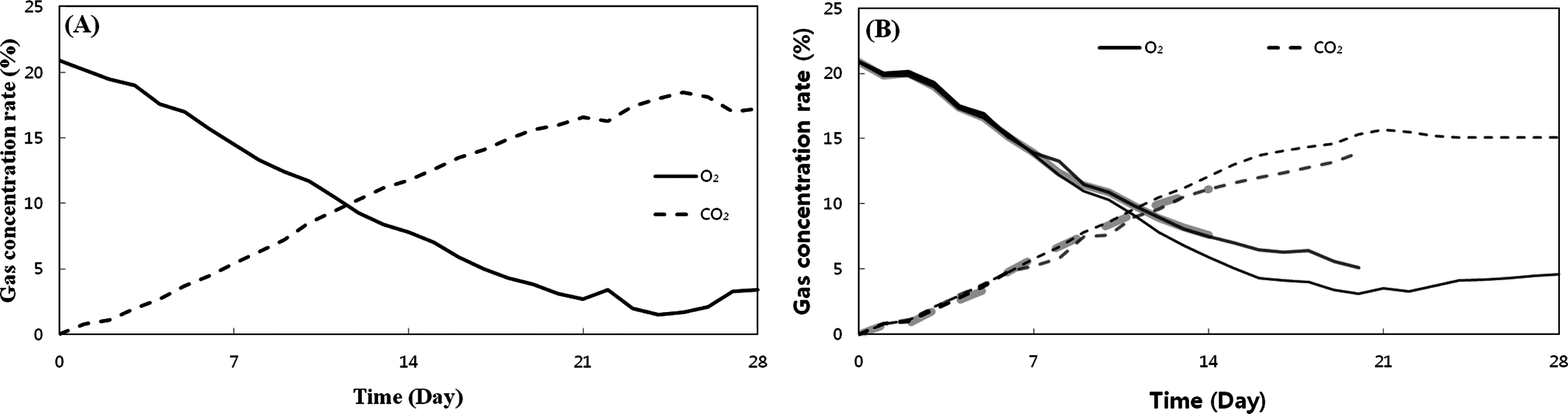 천공면적 Ahole은 저장 농산물의 중량 M과 저장온도에서 의 호흡속도 RCO2 의 곱과 비례관계를 갖으며, 비례상수 c 는 실험적 측정값인 6110을 사용하였다. 4°C에서의 토마토와 파프리카는 호흡속도 8 을 적용하였다 (Gross et al., 2016). 토마토는 4 kg 단위 105박스를 포장 하였으므로 420 kg, 파프리카는 5 kg 단위 20박스를 포장 하였으므로 100 kg가 되며, 계산식에 대입하여 천공면적을 계산하면 토마토와 파프리카는 각각 20.53 mm2와 4.89 mm2의 천공을 하여야 한다. 이를 지름 2 mm 크기의 펀치 로 천공할 경우 6.5개, 1.5개가 된다. 이러한 계산식은 O2 5% 기준이며, 실험 목표는 O2 2-5% 유지를 목표로 하여 토마토와 파프리카에 각각 지름 2 mm 천공 6개, 1개를 적 용하여 실험하였다.