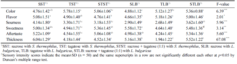 발효가 완료된 요구르트를 4°C에서 48시간동안 냉장 보 관한 후 관능적 강도 평가와 기호도 평가를 50명의 패널을 대상으로 실시하였다. 관능적 특성의 강도를 알아보기 위하 여 색(color), 향(flavor), 신맛(sourness), 단맛(sweetness), 후 미(aftertaste), 점도(thickness)에 대한 평가를 9점 척도법으 로 실시하여 강도가 클수록 높은 점수를 주도록 관능평가 를 실시한 결과는 Table 3과 같다. 요구르트의 관능적 강 도 평가 결과 색상(color)에 있어서는 설탕만 첨가한 대조 구에 비해 타가토스가 첨가된 요구르트에서 약간 진한색이 나타나는 것으로 평가되었고, S. thermophilus로 발효시킨 대조구가 가장 강한 신맛(sourness)을 나타냈으며 그에 비 해 타가토스 첨가구는 신맛의 강도가 유의적으로 약한 것 으로 평가되었다. 향(flavor)과 단맛(sweetness)의 경우에는 설탕과 타가토스의 첨가에 따른 유의적인 차이가 거의 나 타나지 않았으며 후미(aftertaste)는 설탕 첨가구가 타가토스 첨가구에 비해 높게 평가되었다. S. thermophilus로 발효시 킨 대조구의 점도(thickness)가 가장 높게 평가되었고 타가 토스 첨가구에 비해서도 유의적으로 높게 평가되었다. 또 한 외관(appearance), 향(flavor), 맛(taste), 조직감(texture), 종합적인 기호도(overall acceptability)에 대하여 9점 척도 법으로 기호도 평가를 실시한 결과는 Table 4에 나타내었 다. 외관(appearance)의 경우 대조구의 선호도가 타가토스 첨가구에 비해 약간 좋게 평가되었으나 향(flavor)의 경우 L. bulgaricus로 발효시킨 타가토스 첨가 요구르트의 선호 도가 유의적으로 가장 높게 평가되었고 S. thermophilus로 발효시킨 대조구가 가장 낮은 선호도를 보였다. 맛(taste)과 조직감(texture)에서는 대조구가 타가토스 첨가구에 비해 약 간 높은 선호도를 나타내었으나 설탕과 타가토스를 혼합하 여 첨가한 요구르트와는 유의적인 차이가 나타나지 않았다 (p<0.05). 종합적인 기호도(overall acceptability)에 대해서는 설탕과 타가토스 혼합 첨가구가 타가토스 첨가구에 비해 유의적으로 높은 점수를 받았고 대조구와는 유의적인 차이 가 나타나진 않았지만 평균값에서 더 높은 점수를 얻었다. 요구르트의 품질을 결정하는 중요한 관능적 요소로는 일반 적으로 외관(색상), 향미, 맛, 조직감을 들 수 있는데(Cho et al., 2008) 본 연구에서의 관능 평가 결과를 종합해 볼 때 외관(appearance)의 경우 설탕 첨가구의 선호도가 향 (flavor)의 경우 타가토스 첨가구의 선호도가 높은 평가를 받았으나 맛(taste), 조직감(texture), 종합적인 기호도(overall acceptability)에 대한 선호도에서는 전반적으로 설탕과 타 가토스 혼합 첨가구가 타가토스 첨가구에 비해 높은 점수 를 받았으며 대조구와는 유의적인 차이가 나타나지 않아 타가토스를 설탕과 혼합하여 사용한다면 설탕을 첨가한 요 구르트와는 관능적인 차이를 나타내지는 않으면서 칼로리 와 혈당지수(GI) 값을 낮춘 요구르트 제조에 이용할 수 있 을 것으로 판단된다.