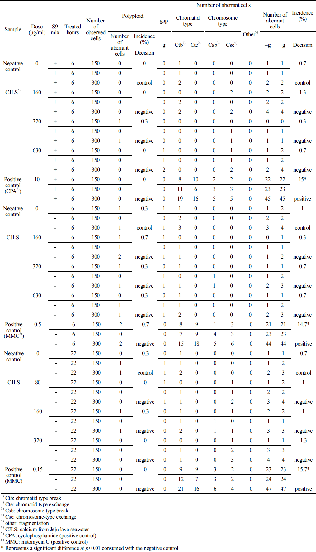 No significant differences in the frequency of numerical and structural chromosomal aberrations were observed between the CJLS and the control group. However, for the positive control substances CPA and MMC treatments, significant differences in the frequency of structural chromosomal aberrations were observed between the positive control group and the negative control group (p<0.01). Therefore, the test substance, CJLS, does not induce numerical or structural chromosomal aberrations.
